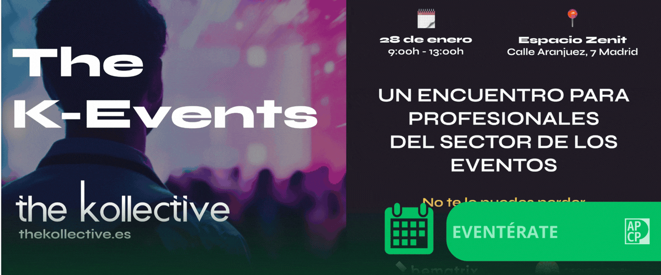 - La APCP colabora con The K-Events, un encuentro profesional organizado por The Kollective que se celebrará el próximo 28 de enero para reunir a directivos y profesionales del sector de eventos, comunicación y producción. La jornada incluirá mesas redondas sobre medición y ROI, sostenibilidad, inteligencia artificial generativa y el valor de los datos, además de casos de éxito y networking. El programa completo y entradas están disponible en su web. Las productoras y postproductoras socias de APCP pueden solicitar entradas gratuitas poniéndose en contacto con comunicacion@apcp.es.