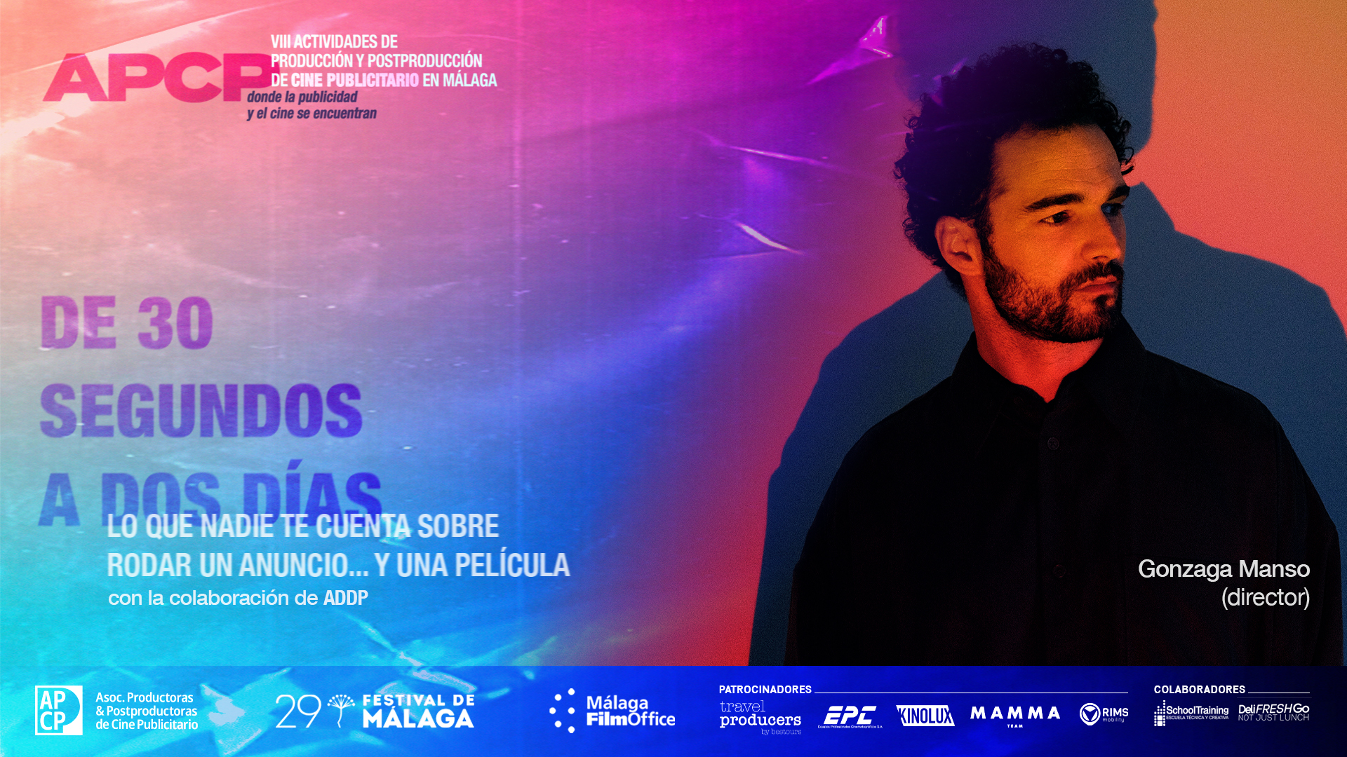 Bajo el título “De 30 segundos a Dos Días”, el director Gonzaga Manso ofrecerá una mirada honesta, cercana y reveladora sobre las diferencias —y las sorprendentes similitudes— entre dirigir un anuncio y rodar un largometraje. Una ponencia posible gracias a la colaboración con la ADDP, que se convierte en una oportunidad única para descubrir todo aquello que no suele contarse sobre los procesos creativos, técnicos y humanos que hay detrás de ambos formatos.