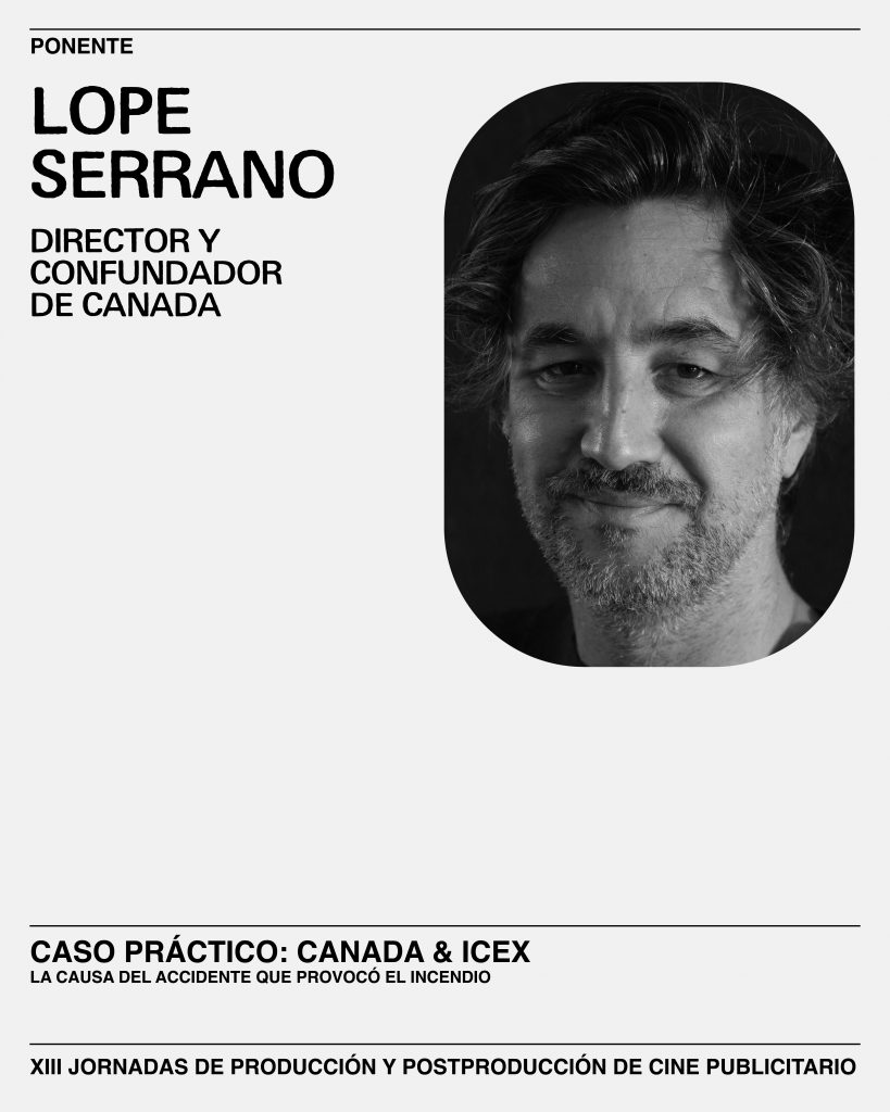Su director, Lope Serrano (1976), es una de las figuras más reconocidas del audiovisual contemporáneo. Socio cofundador de CANADA, Serrano escribió —junto a Santi Ruffa y Davis Silis— y dirigió “La causa del accidente que provocó el incendio”, una pieza galardonada internacionalmente en festivales como D&AD, Ciclope y Cannes, entre otros. En su filmografía destacan títulos como “Crème Caramel”, que consolidó a CANADA como un motor cultural, o “Sound and Vision”, un homenaje a David Bowie. También ha dirigido piezas comerciales para Longchamp o Miu Miu, y videoclips icónicos como “The Less I Know The Better” para Tame Impala, “Physical” y “Love Again” para Dua Lipa, trabajos premiados en múltiples ocasiones. Su estilo, de reconocimiento internacional, ha atraído a clientes como H&M, Expedia, Instagram, Budweiser o Louis Vuitton. Su obra más reciente, “Hornbach – No Project Without Drama” (2025), fue distinguida con seis Oros y un Grand Prix en Ciclope.