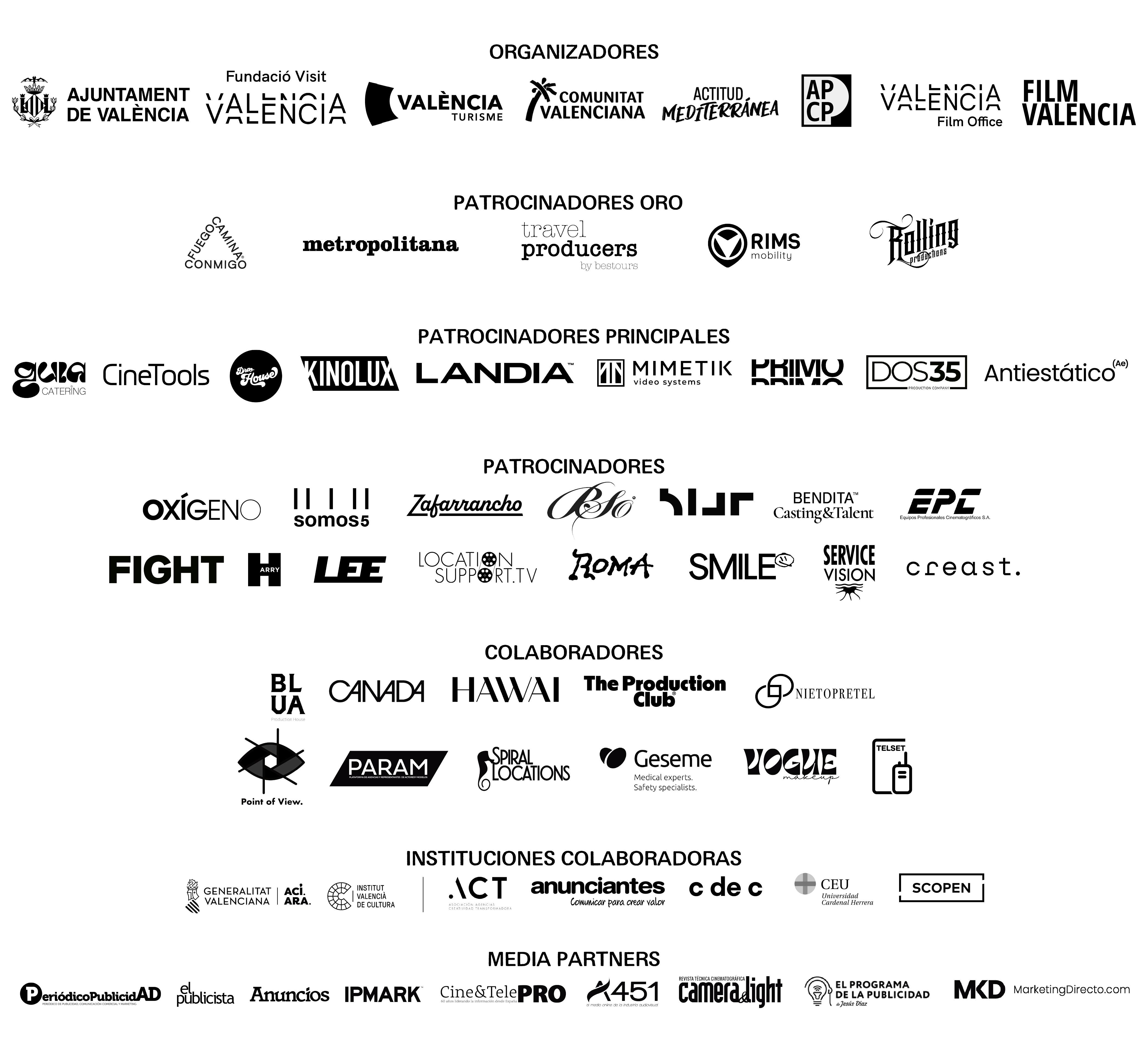 Los galardones cuentan con más de 20 categorías, como Mejor Producción, Mejor Dirección, Dirección de Fotografía, Casting, Montaje, SFX, o el Premio Magda a Mejor Colorista, entre otros. Además, también se valoran agentes clave del sector como la Mejor Agencia, Mejor Anunciante o la Mejor Administración Pública, y se corona a la Mejor Producción del Año.