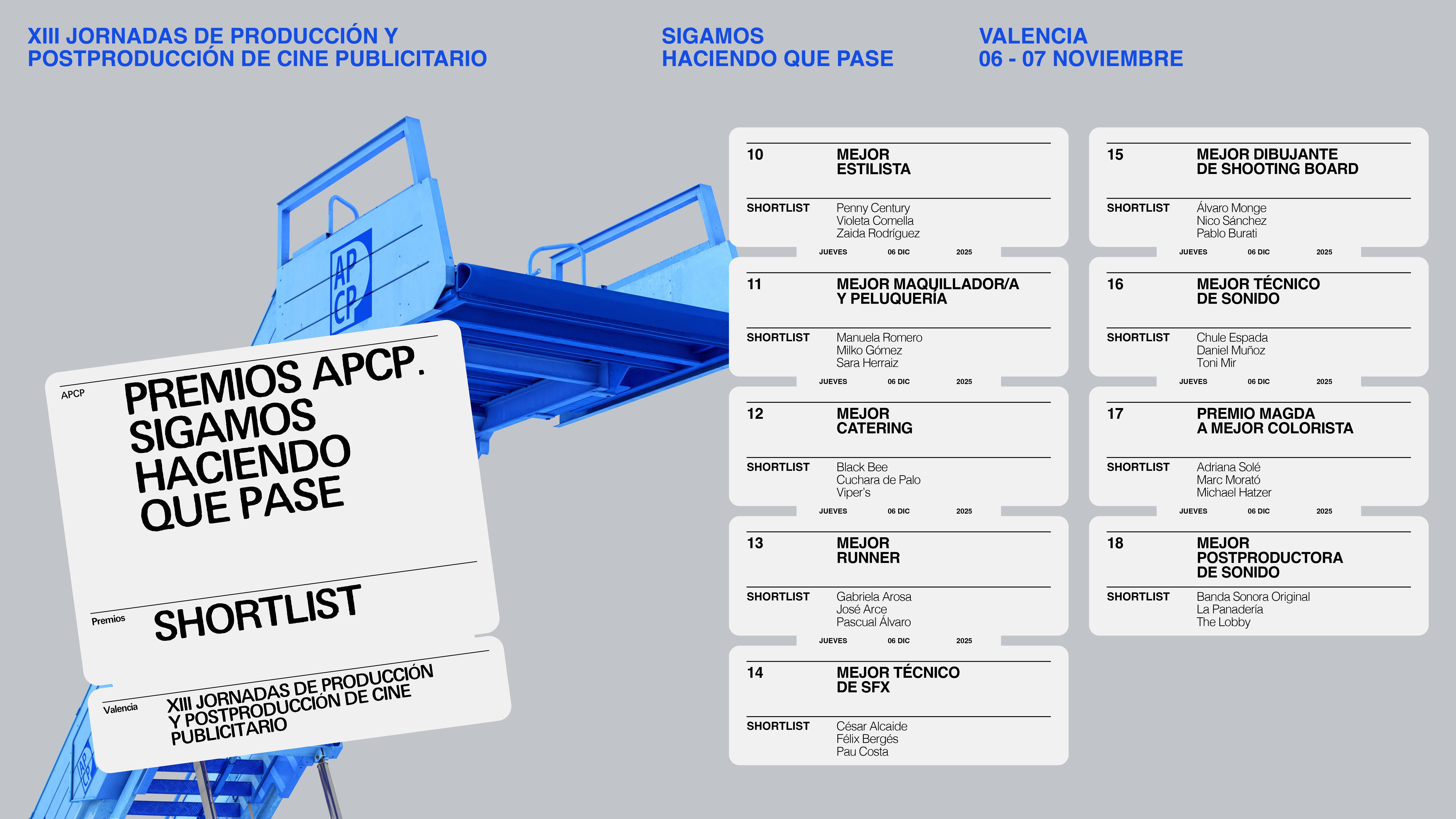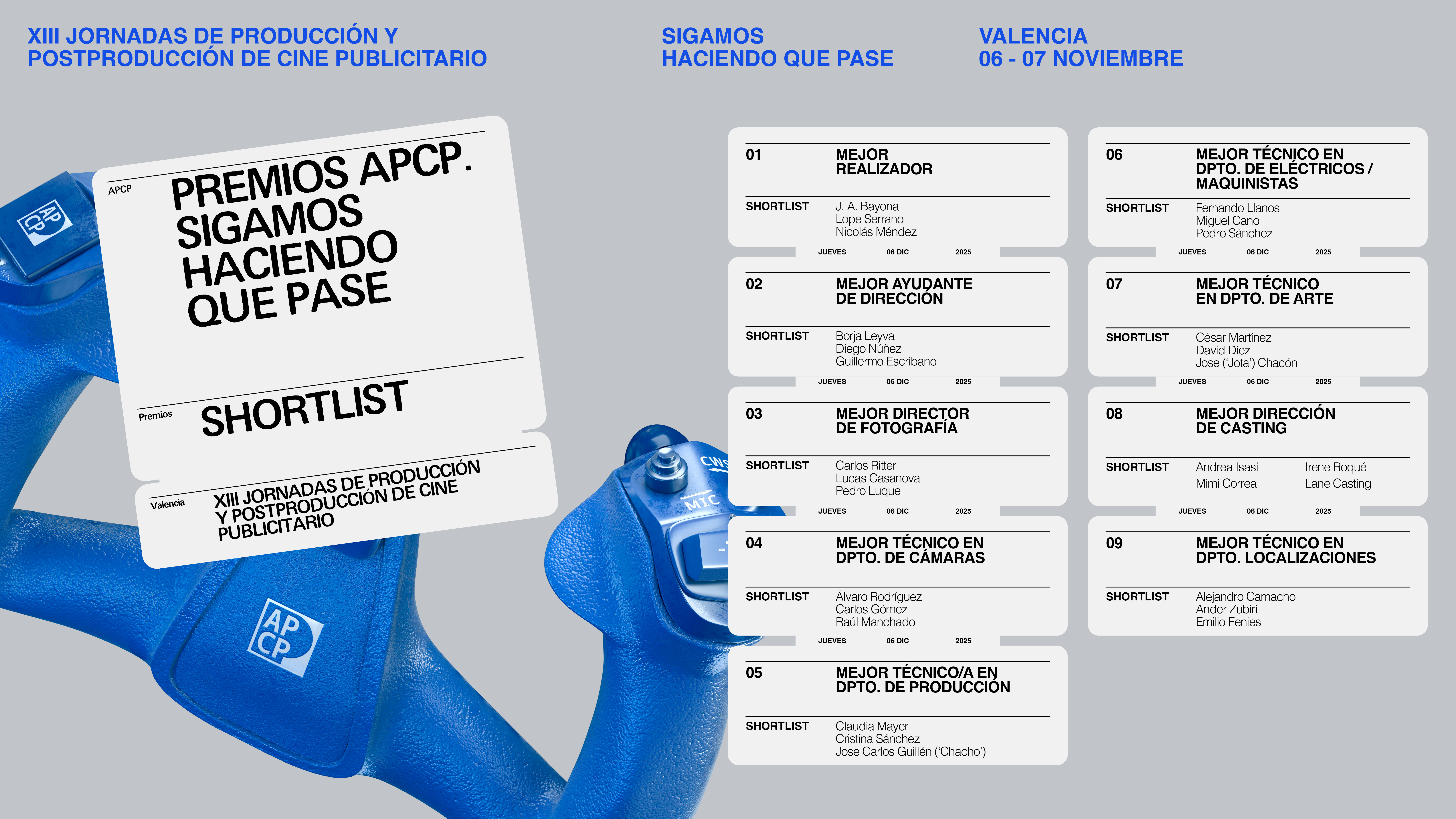 Tras el proceso de selección y votación del jurado y de nuestras asociadas, el próximo 6 de noviembre podremos conocer a los ganadores que representan lo mejor del cine publicitario en España en una gala presentada por Topacio Fresh en el marco de las XIII Jornadas de Producción y Postproducción de Cine Publicitario en Valencia.